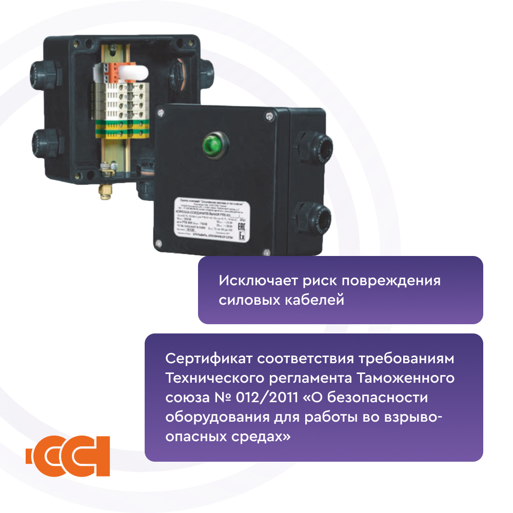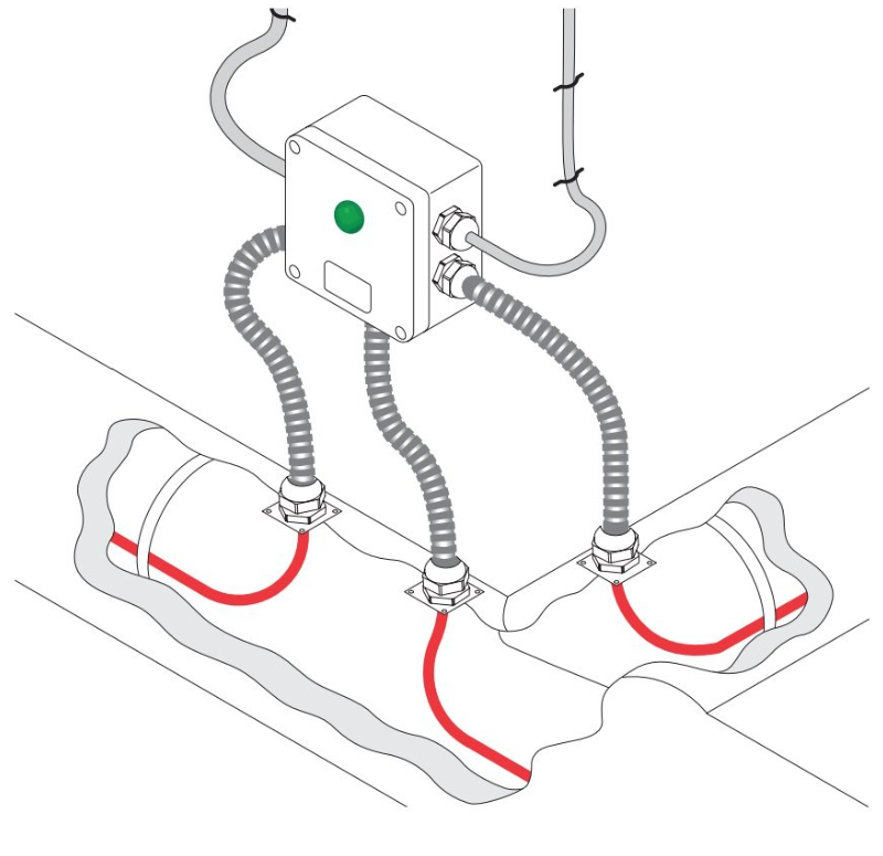 Коробка крепится на стене здания, на близлежащей металлоконструкции или при помощи кронштейна непосредственно на трубопроводе. Коробка позволяет выполнить подключение до трех ниток саморегулирующихся электрических нагревательных кабелей к силовому кабелю для коробок с винтовыми клеммными соединителями и до двух ниток для коробок с пружинными клеммными соединителями.