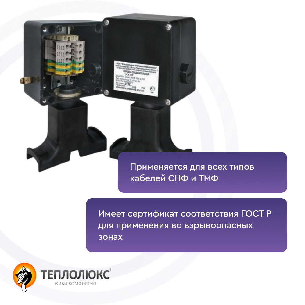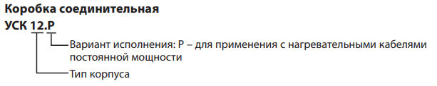 Коробка соединительная УСК 12.Р предназначена для подключения к силовой сети электрических нагревательных кабелей постоянной мощности типа СНФ и ТМФ. Коробка крепится непосредственно на трубопроводе. Коробка позволяет выполнить подключение одного или двух ниток нагревательных секций «петлей», либо 3 секций по схеме «звезда».