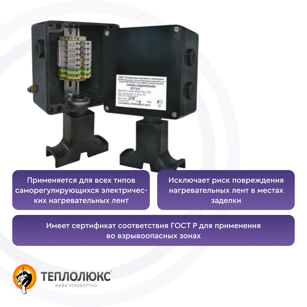 Более 10 000 по всей РоссииКоробка соединительная УСК 16.Н предназначена для подключения к силовой сети саморегулирующихся электрических нагревательных лент. Коробка крепится непосредственно на трубопроводе. Коробка позволяет выполнить подключение до четырех саморегулирующихся электрических нагревательных лент.