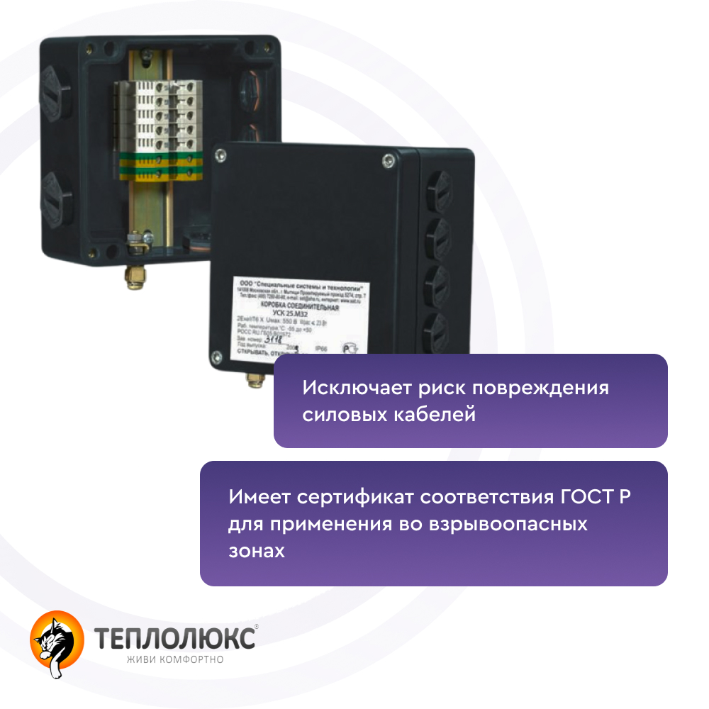 Коробка соединительная УСК 250.М32 предназначена для подключения силовых кабелей питания систем электрообогрева. Коробка крепится на близлежащей металлоконструкции. Коробка позволяет выполнить подключение до шести силовых кабелей.