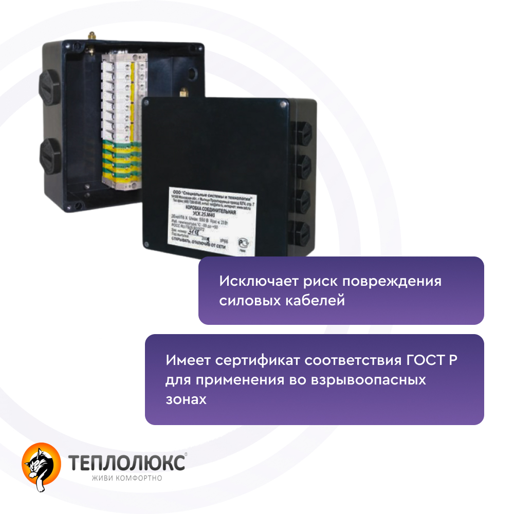 Более 10 000 по всей РоссииКоробка соединительная УСК 250.М40 предназначена для подключения силовых кабелей питания систем электрообогрева. Коробка позволяет выполнить подключение до шести силовых кабелей.