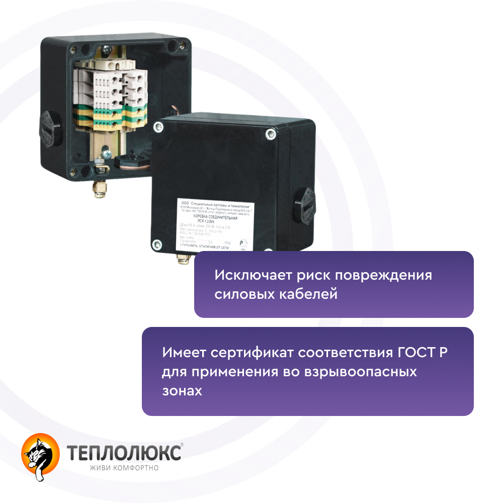 Коробка соединительная УСК 12.БН предназначена для подключения к силовой сети саморегулирующихся электрических нагревательных лент. Коробка крепится при помощи кронштейна непосредственно на трубопроводе или близлежащей металлоконструкции, стене здания. Коробка позволяет выполнить подключение до одной или двух саморегулирующихся электрических нагревательных лент к силовому кабелю.