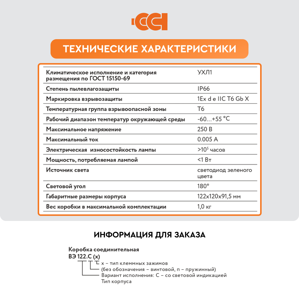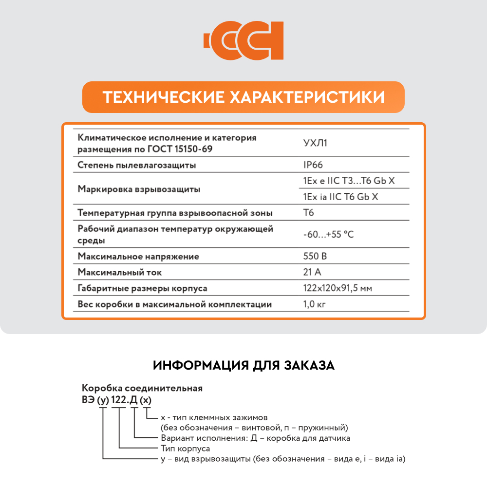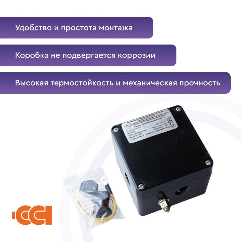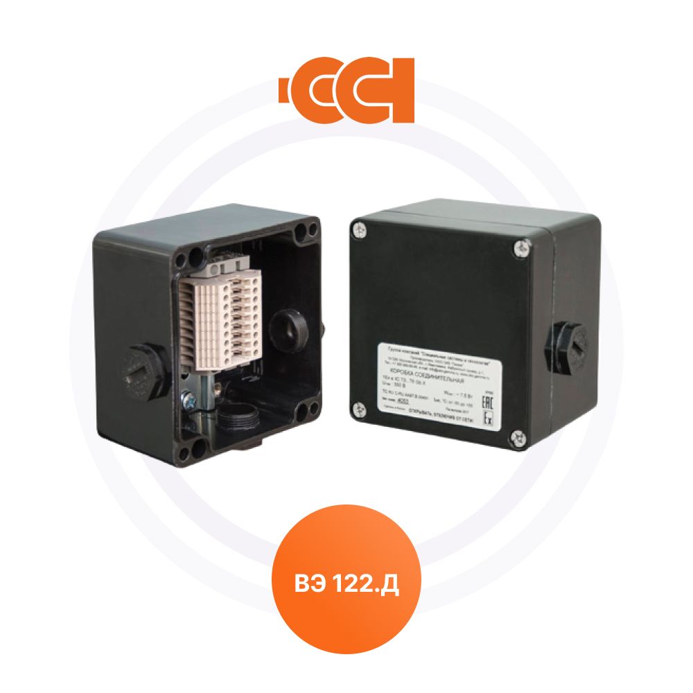 Конструкция корпуса обеспечивает защиту от проникновения влаги и пыли степени IP66 и высокую коррозионную стойкость. Применяемые клеммные наборы позволяют подключить многожильные или одножильные провода сечением от 0,5 до 2,5 мм2 . Для заказов доступны исполнения коробок с винтовыми или пружинными клеммными зажимами, а также с различными видами взрывозащиты – вида e (повышенная надежность) и вида ia (искробезопасная электрическая цепь). Гарантия на коробку ВЭ 122.ДУ составляет 1 год с момента продажи.
