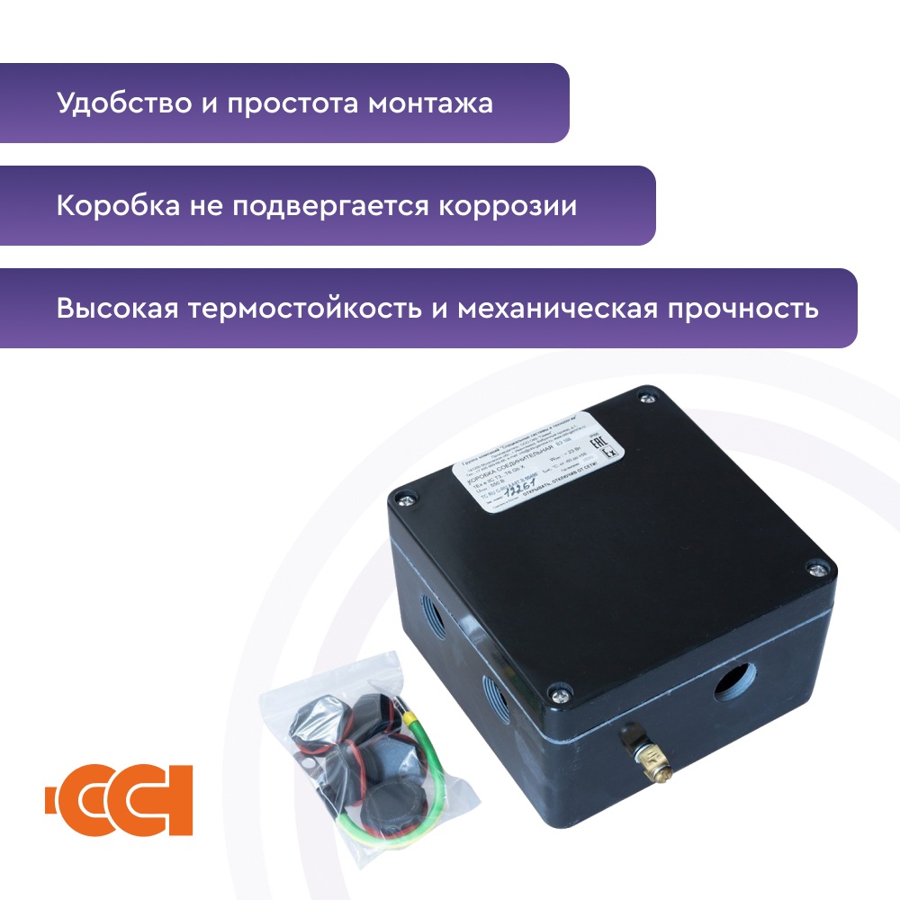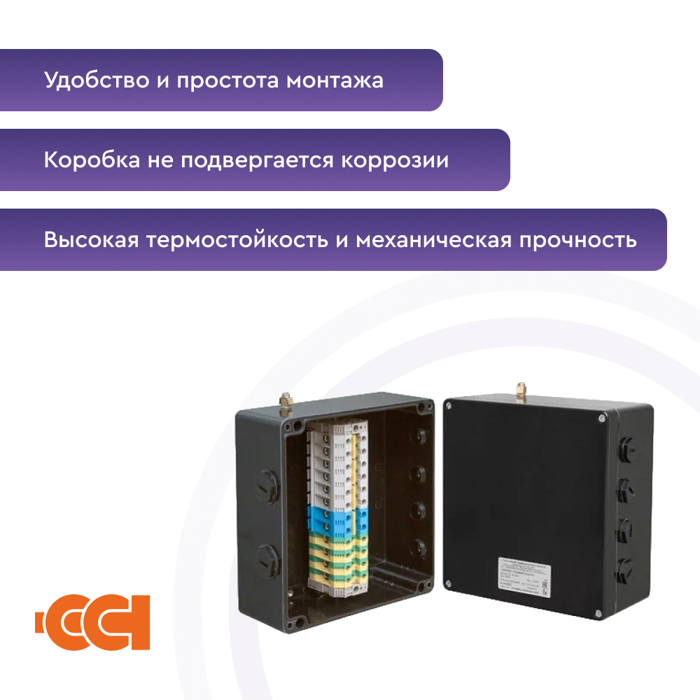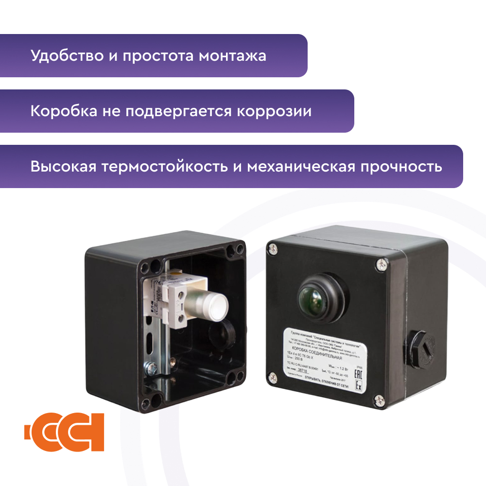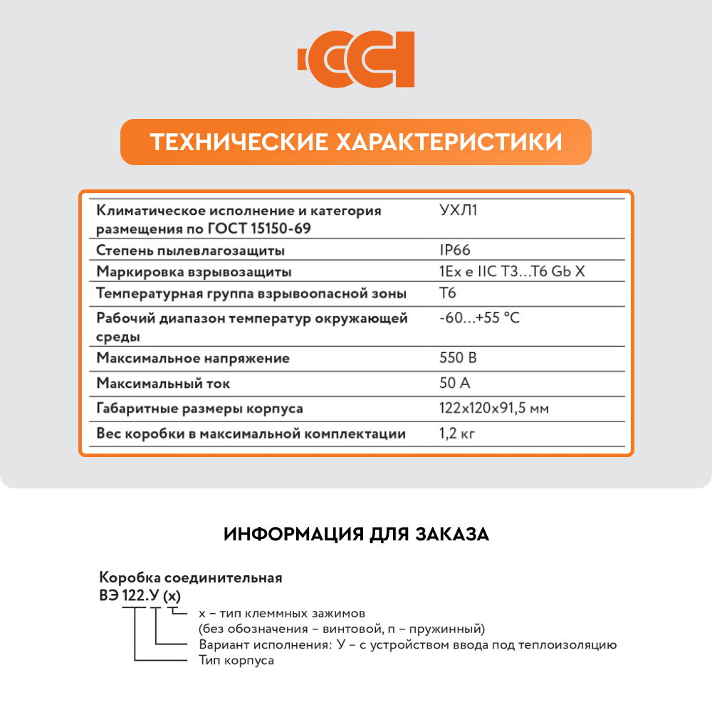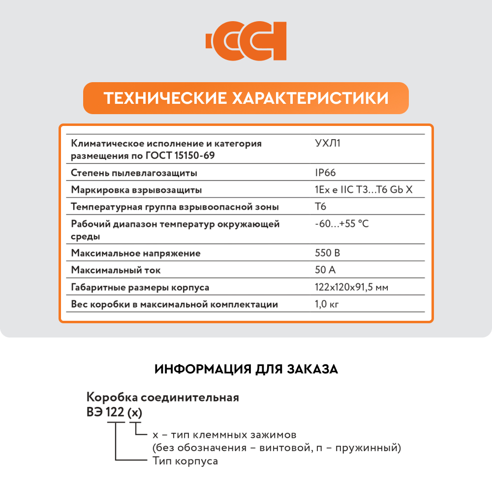 Конструкция корпуса обеспечивает защиту от проникновения влаги и пыли степени IP66 и высокую коррозионную стойкость. Применяемые клеммные наборы позволяют подключить многожильные или одножильные провода сечением от 0,5 до 2,5 мм2 . Для заказов доступны исполнения коробок с винтовыми или пружинными клеммными зажимами, а также с различными видами взрывозащиты – вида e (повышенная надежность) и вида ia (искробезопасная электрическая цепь). Гарантия на коробку ВЭ 122.ДУ составляет 1 год с момента продажи.