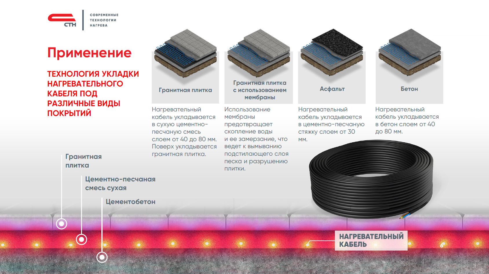 Пример монтажа греющего кабеля СТН для обогрева открытых площадей в зависимости типа внешнего покрытия.