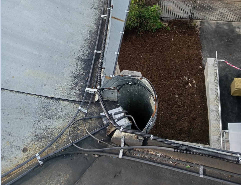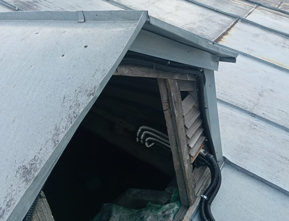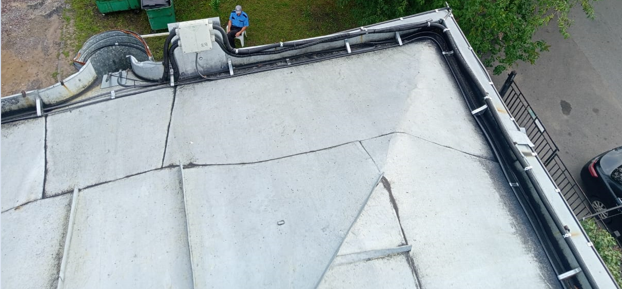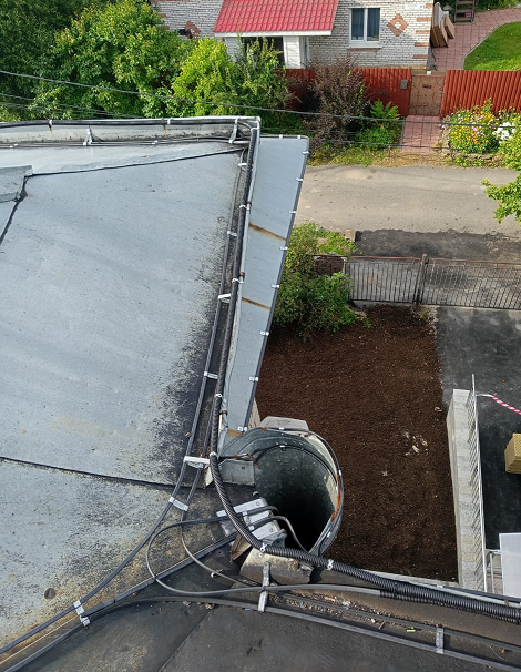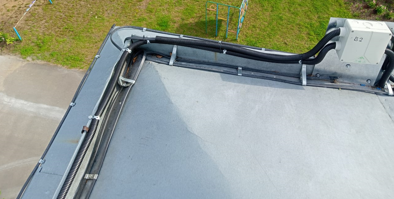 Монтажная группа проложила силовой кабель ВВГнг(А) 3х2.5 от щита управления до крыши. Кабель был защищен гофрированной трубой ПНД d20, что обеспечивает его долговечность и защиту от механических повреждений и УФ-излучения. На следующем этапе были установлены распределительные коробки АВOX100 и АВOX40, к которым подключены силовые кабели и греющий кабель. Также на крыше были установлены датчики воды, осадков и температуры, которые обеспечивают автоматический контроль работы системы обогрева.
