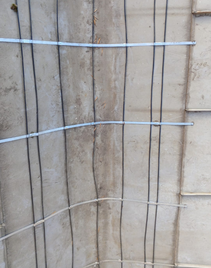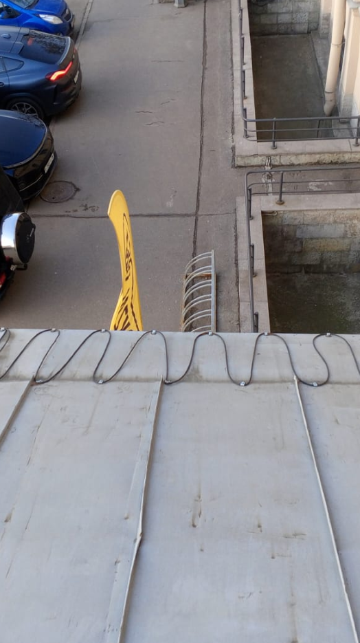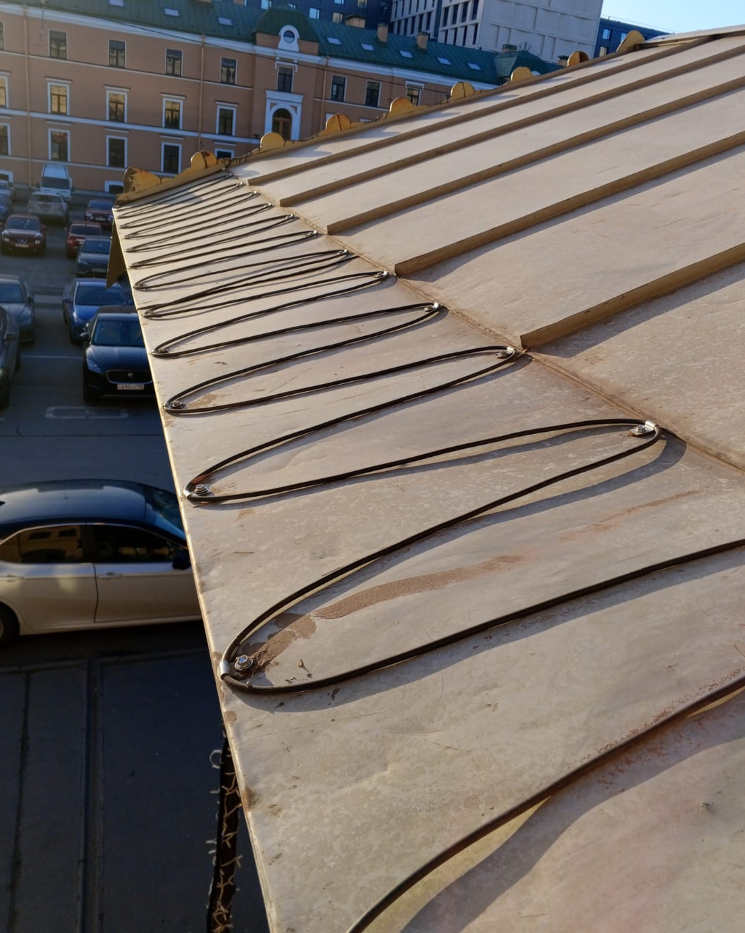 По краю козырьков был уложен резистивный нагревательный кабель 30РНК-2-01-0370-040 змейкой, что обеспечивает равномерное распределение тепла и предотвращает образование наледи и сосулек на краю свеса. В водосточных трубах кабель был уложен в одну / две нитки, что позволяет эффективно бороться с замерзанием воды и предотвращает засоры. В местах стыка козырьков кабель был уложен в несколько ниток, что обеспечивает максимальную площадь обогрева и предотвращает образование заторов талой воды.