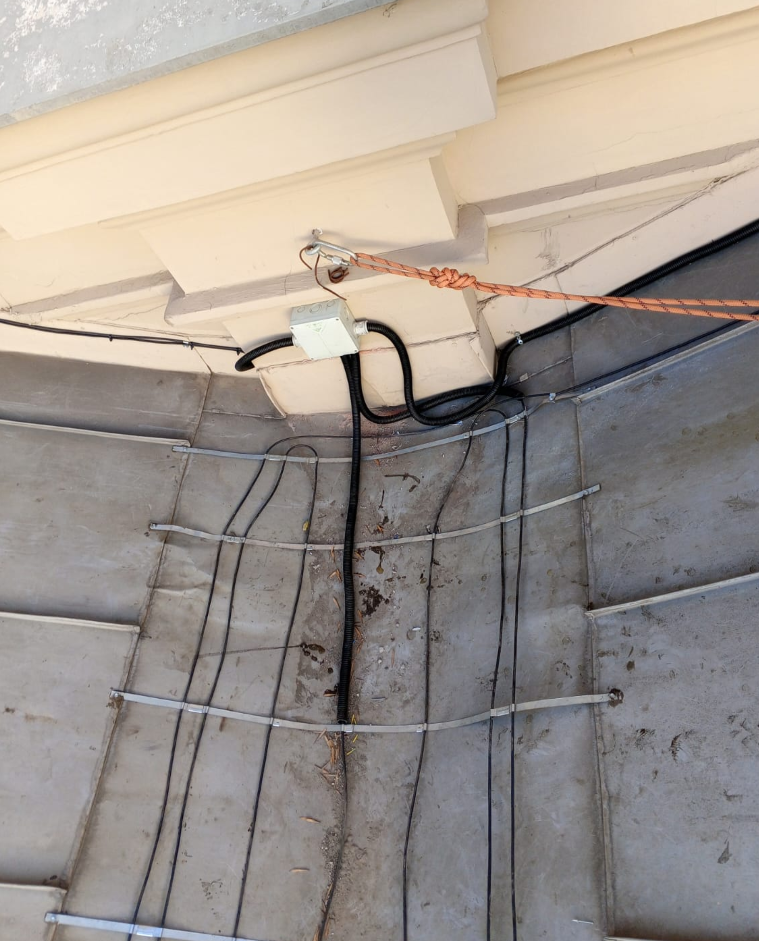 Для надежной фиксации кабеля в водосточных трубах использовались: трос в ПЭ оболочке 2,8, зажимы для троса PSK и коуши для троса 3 мм. Кабель был закреплен с помощью крепежных зажимов БРН/Т.1-25 Ц и БРН/Т.2-50 Ц. К краю кровли кабель был закреплен зажимами БРН.1-25 ЦО и кровельными саморезами.