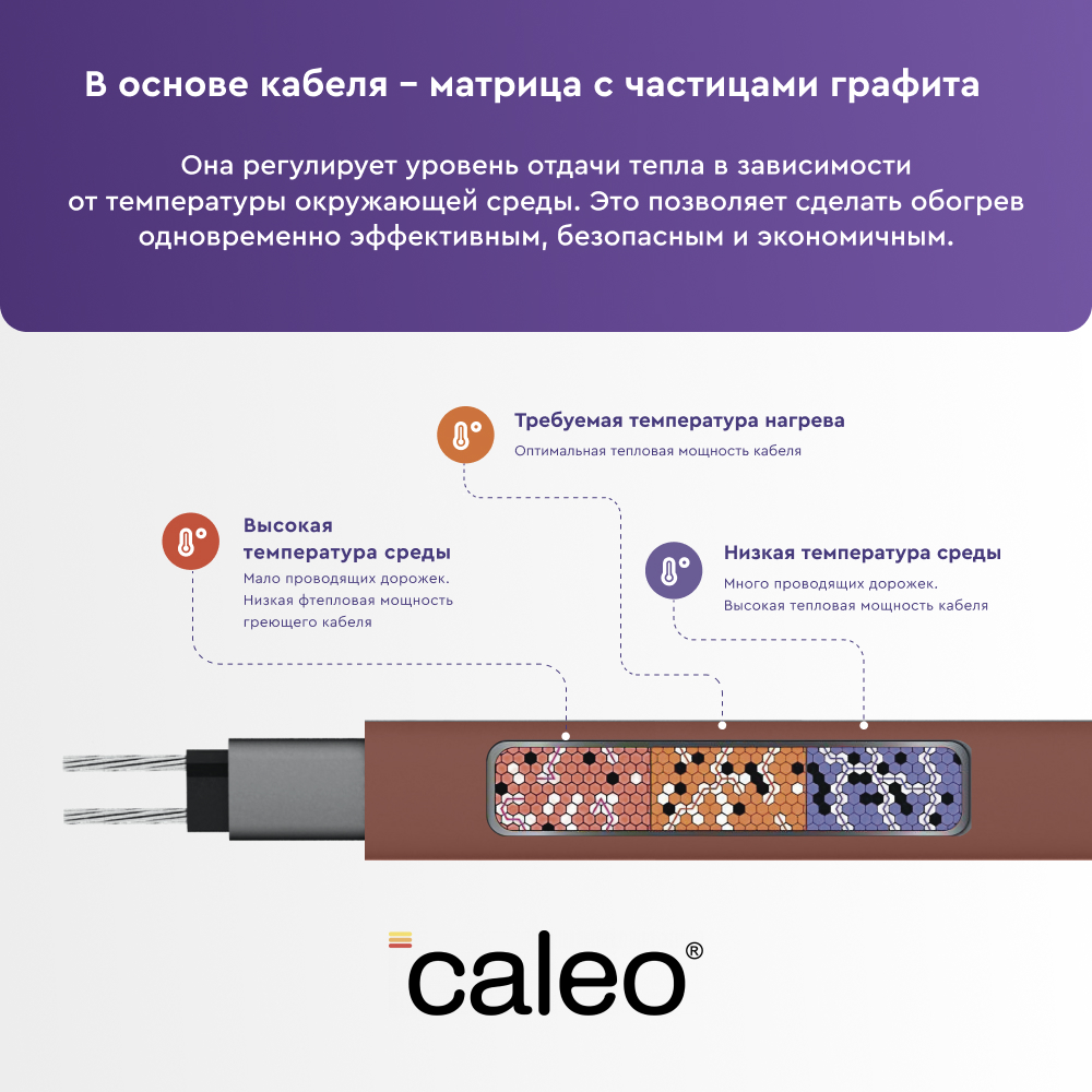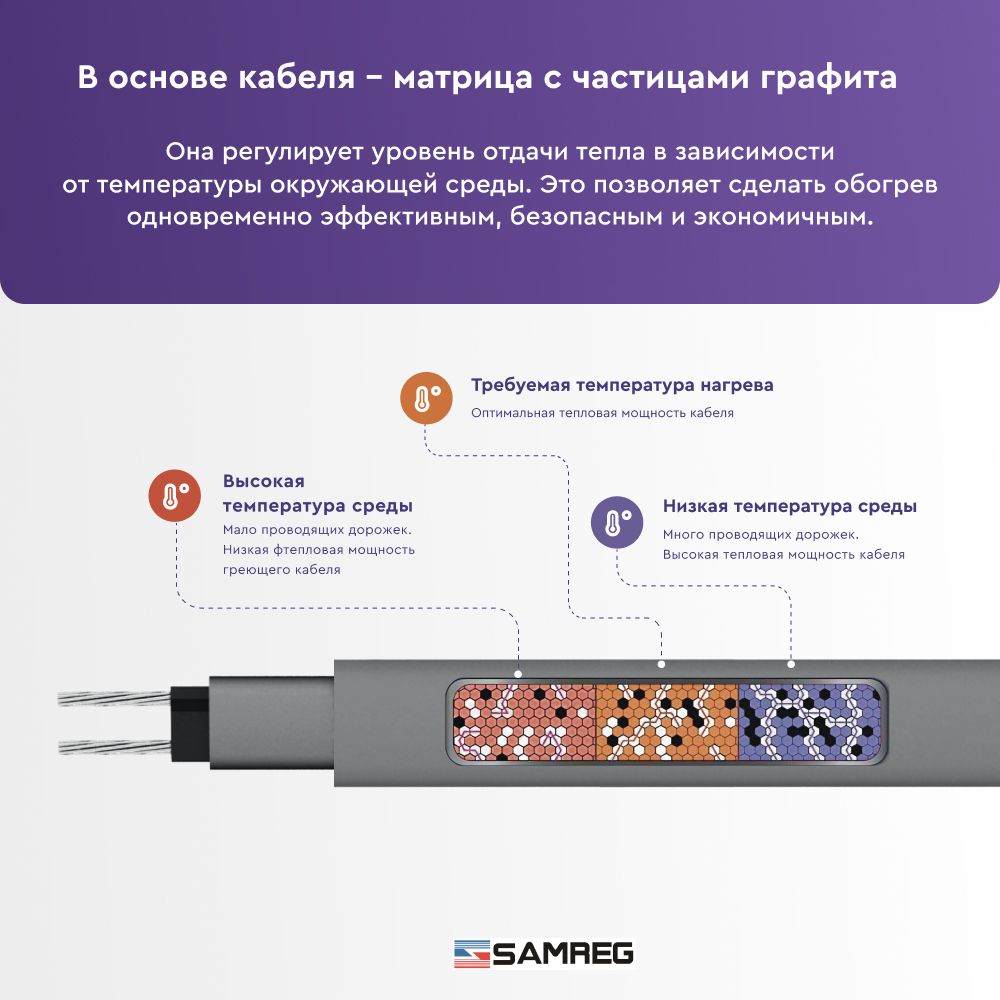 Эти кабели автоматически регулируют свою мощность в зависимости от температуры окружающей среды. Они особенно эффективны в условиях переменной температуры и предотвращают перегрев.-